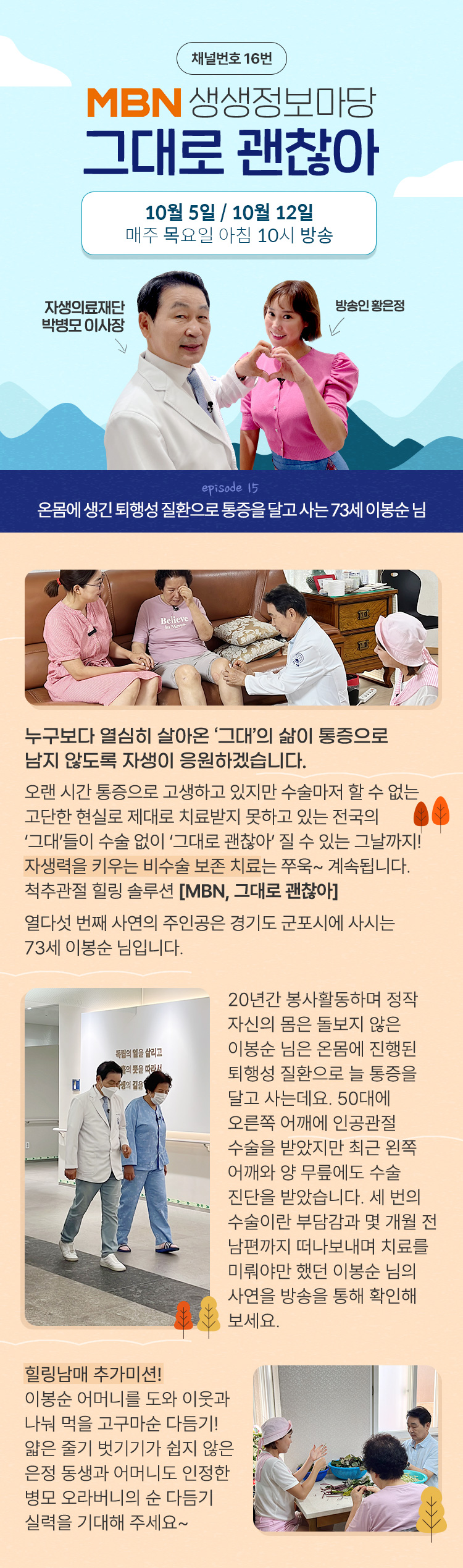 MBN 방송안내 / 프로그램명 MBN 생생정보마당 그대로 괜찮아 / 방송일 10월 5일, 10월 12일 (목) AM 10:00~ / 누구보다 열심히 살아온 ‘그대’의 삶이 통증으로 남지 않도록 자생이 응원하겠습니다 오랜 시간 통증으로 고생하고 있지만 수술조차 할 수 없는 고단한 현실로 제대로 치료받지 못하고 있는 전국의 ‘그대’들이 수술 없이 ‘그대로 괜찮아’ 질 수 있는 그날까지! 자생력을 키우는 비수술 보존 치료는 쭈욱~ 계속됩니다 척추관절 힐링 솔루션 [MBN, 그대로 괜찮아] 열다섯 번째 사연의 주인공은 경기도 군포시에 사시는 73세 이봉순 님입니다 20년간 봉사활동하며 정작 자신의 몸은 돌보지 않은 이봉순 님은 온몸에 진행된 퇴행성 질환으로 늘 통증을 달고 사는데요 50대에 오른쪽 어깨에 인공관절 수술을 받았지만 최근 왼쪽 어깨와 양 무릎에도 수술 진단을 받았는데요 세 번의 수술이란 부담감과 몇 개월 전 남편까지 떠나보내며 치료를 미뤄야만 했던 이봉순 님의 사연을 방송을 통해 확인해 보세요 힐링남매 추가미션! 이봉순 어머니를 도와 이웃과 나눠 먹을 고구마순 다듬기! 얇은 줄기 벗기기가 쉽지 않은 은정 동생과 어머니도 인정한 병모 오라버니의 순 다듬기 실력을 기대해 주세요~