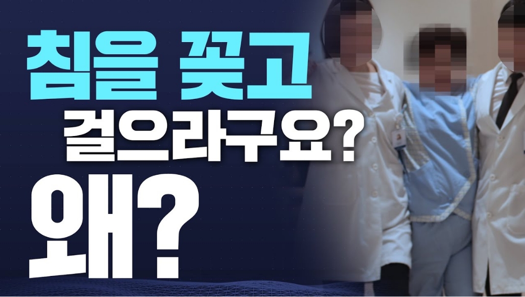의사 2명이 환자를 양쪽에서 잡고 환자의 보행을 돕는 모습